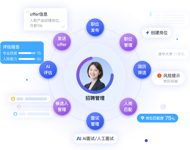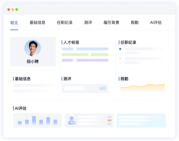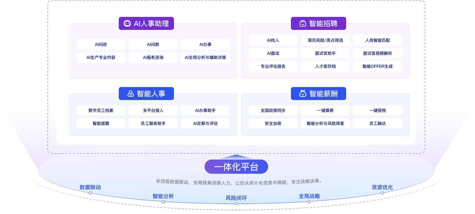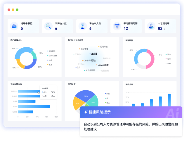 支持全面的招聘、员工管理、薪酬、绩效、考核、风险管理与AI辅助决策